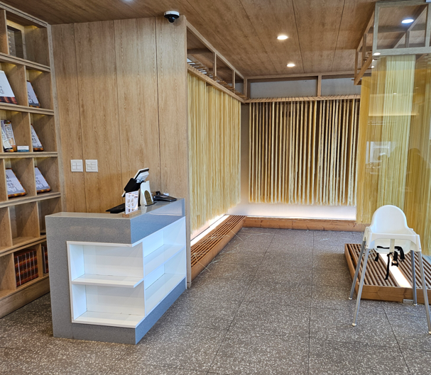 식당 안으로 들어서면 가장 먼저 눈에 띄는 것이 바로 전시된 국수 면입니다. 이런 인테리어는 처음 봤는데, 생각보다 멋스럽고 분위기와도 잘 어울리더군요. 😊