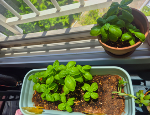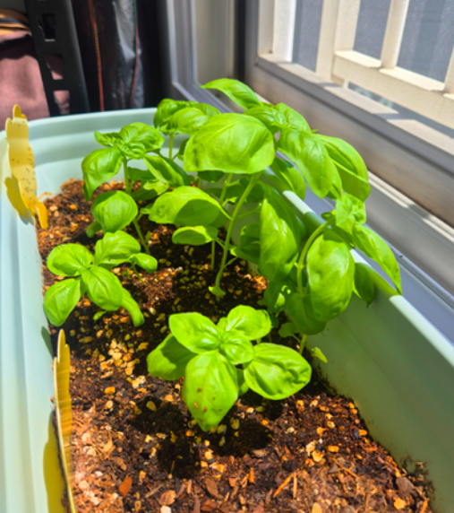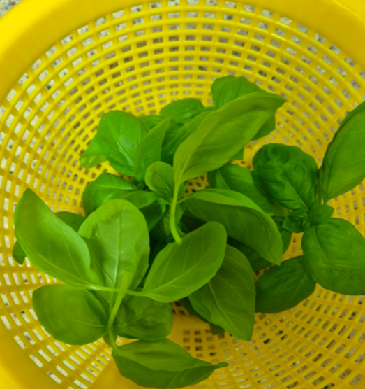 7월 말, 바질이 성인 손바닥만큼 커졌을 때 첫 수확을 했어요. 내 손으로 키운 잎을 자르는 순간의 묘한 떨림… 직접 요리에 쓰니 감회가 새롭더라고요. 바질은 “순따기(꼭지치기)”를 해 주면 양쪽 겨드랑이에서 새로운 가지가 돋아 점점 더 풍성해집니다.