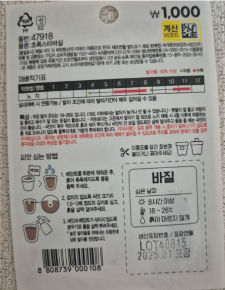 4월, 다이소에서 우연히 발견한 바질 키우기 키트. “이거… 진짜 될까?” 하는 마음으로 심어봤더니, 일주일 만에 새싹이 톡톡 올라오며 홈가드닝의 문이 열렸어요. 구성은 아주 단순합니다. 작은 플라스틱 화분, 상토(흙), 세척 마사토, 바질 씨앗. 처음 키우는 분도 포장 뒷면 설명대로만 따라 하면 쉽게 시작할 수 있어요.