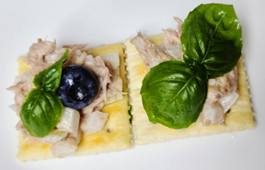 - 재료: 크래커, 크림치즈(또는 리코타), 블루베리·샤인머스켓, 신선한 바질 잎, 올리브오일