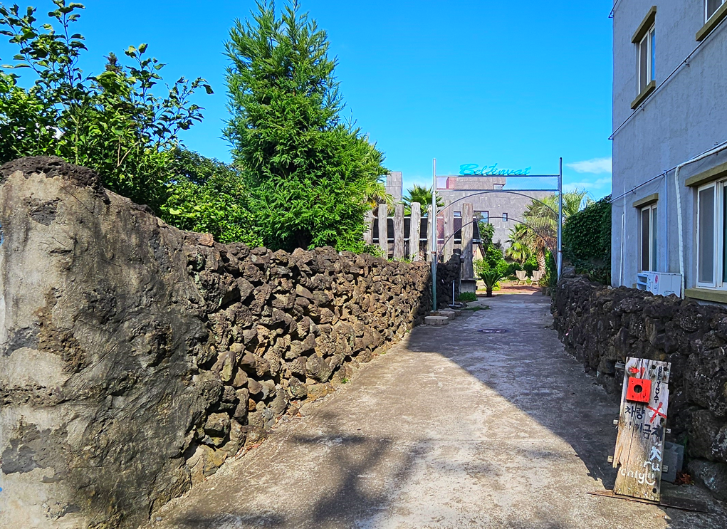 주차장에서 카페까지 약 5분 정도 걸어야 하는데, 날씨가 더울 때는 조금 힘들 수 있답니다. ☀️💦 하지만 골목 입구로 들어서는 순간, 눈앞에 펼쳐지는 카페의 입구 옆 낮은 돌담과 자연과 어우러지는 외관🏡 덕분에 더위가 금세 잊혀졌어요.